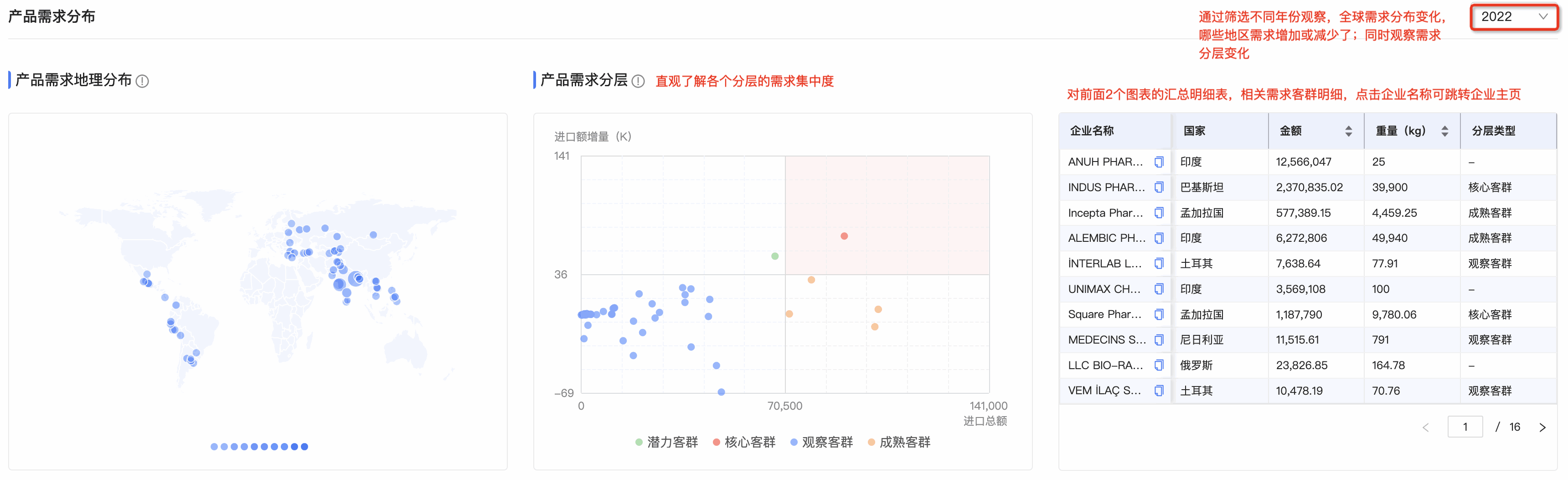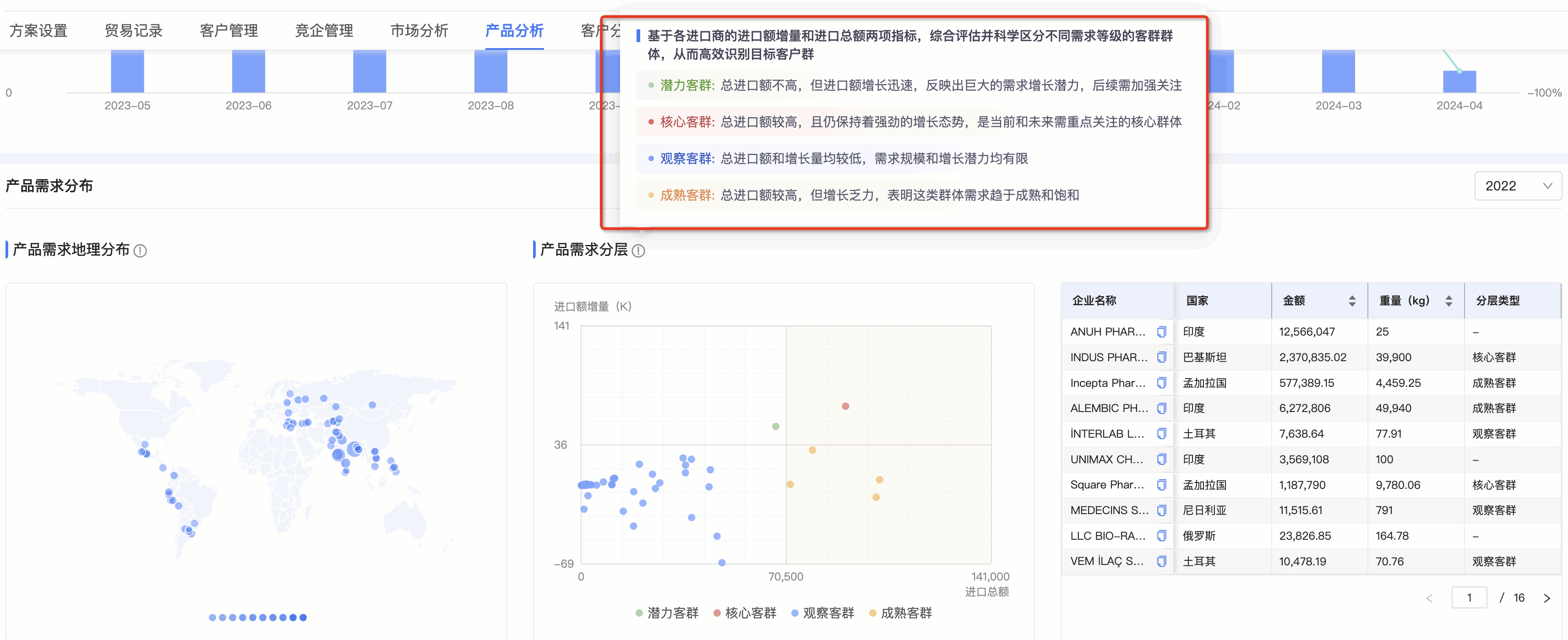 ● 产品需求分层图:bbin宝盈集团官网数据通将需求客群按照进口额增量和总额进行分层,划分为潜力、观察、成熟和核心四个层级。分层有助于用户快速锁定目标客户群体。标题旁附需求分层的解读,能让用户更直观、快速理解每个层级的特征,能够更快速的识别目标客群。