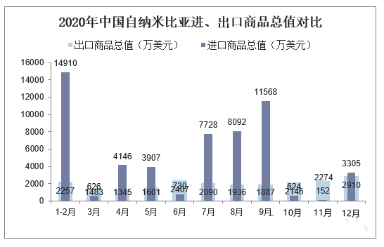 2020年中国对纳米比亚出口商品总值为22311.4万美元,相比2019年增长了2494万美元,同比增长12.6%;2020年中国自纳米比亚进口商品总值为55787.1万美元,相比2019年增长了4676万美元,同比增长9.1%。